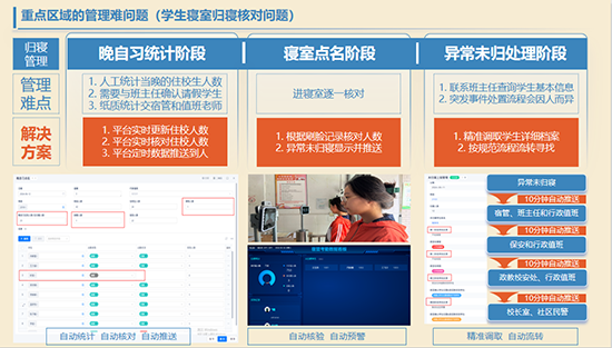 學(xué)校通過智慧校園平臺,打通 “氚云”“釘釘”“魔點(diǎn)”三大平臺的數(shù)據(jù)壁壘,搭建起智能化協(xié)同橋梁,實(shí)現(xiàn)精準(zhǔn)智能預(yù)警:學(xué)生超時(shí)未歸信息會自動推送至社區(qū)民警;心理測評系統(tǒng)對 “三類預(yù)警學(xué)生” 進(jìn)行實(shí)時(shí)分級告警,高危信息可直接同步至定點(diǎn)醫(yī)院,形成完整的風(fēng)險(xiǎn)防控閉環(huán)。