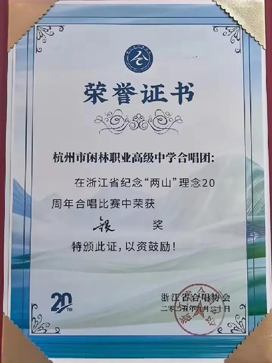 9月20日,由浙江省合唱協(xié)會(huì)主辦的紀(jì)念“兩山”理念20周年合唱決賽在浙江音樂(lè)學(xué)院圓滿落幕。杭州市閑林職業(yè)高級(jí)中學(xué)合唱團(tuán)與來(lái)自全省各地市包括浙江音樂(lè)學(xué)院、浙江歌舞劇院、浙江文旅集團(tuán)等團(tuán)隊(duì)在內(nèi)的26支專業(yè)隊(duì)伍同臺(tái)競(jìng)技,憑借出色的表現(xiàn)和穩(wěn)定的發(fā)揮,成為大賽一道靚麗的風(fēng)景線,榮獲大賽銀獎(jiǎng)!