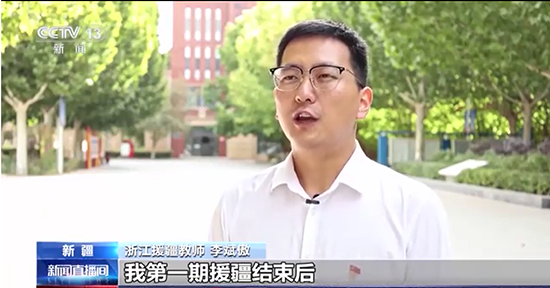 報(bào)道中,浙江省玉環(huán)市援疆教師李斌傲接受采訪。他表示:“作為一名95后援疆教師,我第一期援疆結(jié)束后,又主動(dòng)申請(qǐng)?jiān)僖淮卧?,投身援疆倍感光榮。我們要接續(xù)努力,一批接著一批干,為新疆教育水平提升和人才培養(yǎng),盡自己所能做好工作,傳承‘胡楊精神’,和新疆各族干部群眾一起譜寫(xiě)中國(guó)式現(xiàn)代化新疆篇章。”