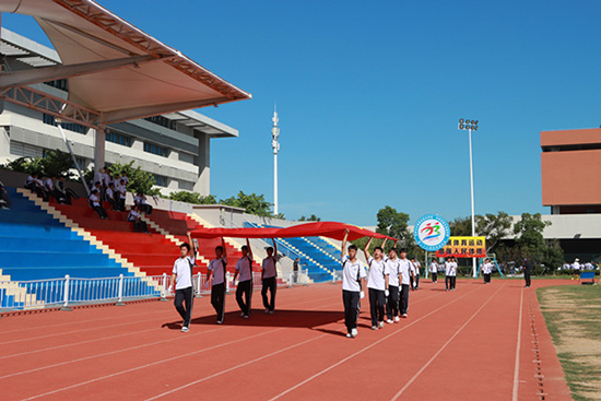 伴隨著激昂雄壯的運動員進行曲,運動會入場式正式開啟。國旗護衛(wèi)隊邁著鏗鏘有力的步伐率先登場,鮮艷的旗幟在朝陽下熠熠生輝,瞬間點燃全場師生的愛國情懷與運動熱情。隨后,會徽隊、鮮花隊、紅旗隊、裁判員以及各班級方陣依次有序入場,同學們身著整齊服裝,以嘹亮的口號、整齊的步伐展現(xiàn)出職教學子的朝氣與活力,每一個身影都成為賽場上最靚麗的風景線。
