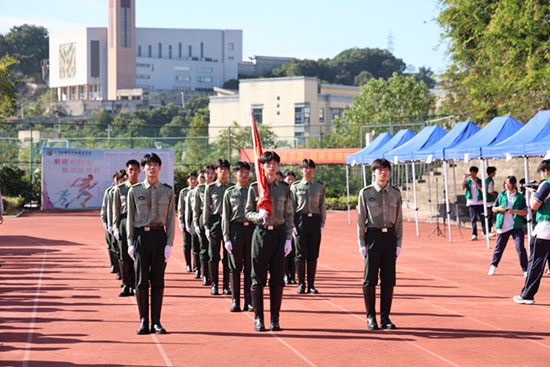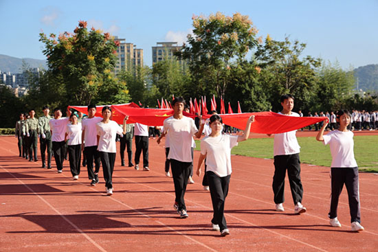 在莊嚴肅穆的升旗儀式中,全場肅立。五星紅旗在護旗手的護衛(wèi)下緩緩入場,伴隨著雄壯的《義勇軍進行曲》冉冉升起,國歌聲聲,激蕩著每個人的愛國情懷與體育精神。