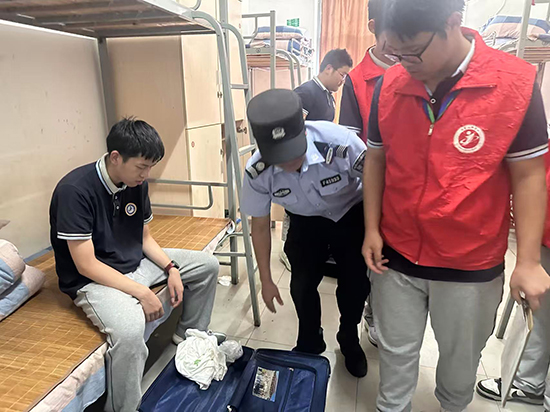 城東派出所由楊金龍警官帶隊,27名干警參與此次活動。在學(xué)生干部的協(xié)助下,由相關(guān)班主任帶隊,干警們對學(xué)生寢室進(jìn)行了認(rèn)真檢查,特別是對于衣柜、皮箱等容易藏匿物品的地方進(jìn)行了逐個檢查。