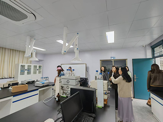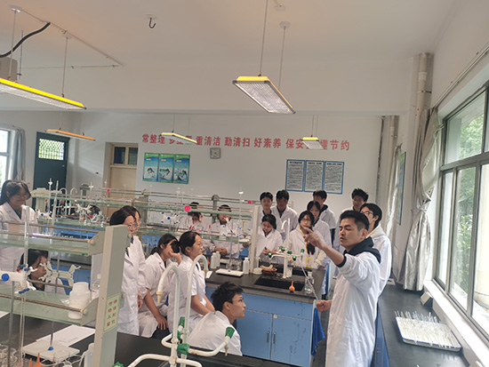 一行人首先走進(jìn)高三分析化學(xué)實(shí)驗(yàn)課堂。課堂上,金曉董老師講解深入淺出,示范規(guī)范認(rèn)真;學(xué)生們仔細(xì)觀察、熟記于心,嚴(yán)格遵守實(shí)驗(yàn)要求,按流程規(guī)范操作。整個(gè)課堂井然有序,師生互動(dòng)良好,充分體現(xiàn)了“做中學(xué)、學(xué)中做”的教學(xué)理念。