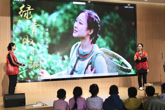 簽約儀式后,學(xué)校幼兒保育專業(yè)學(xué)生們?yōu)槟咸變簣@的幼兒們帶來一場生動有趣的志愿服務(wù)活動《江南童韻樂——綠青山小調(diào)組歌音樂活動》?;顒又校瑢W(xué)生們化身“小老師”,用童趣化的語言向幼兒講解《綠青山小調(diào)組歌》中蘊(yùn)含的生態(tài)環(huán)保理念與湖州本土非遺文化,通過歌曲學(xué)唱、節(jié)奏律動、樂器互動等形式,引導(dǎo)孩子們感受音樂之美、自然之美。幼兒們積極參與、踴躍互動,現(xiàn)場氛圍熱烈溫馨。
