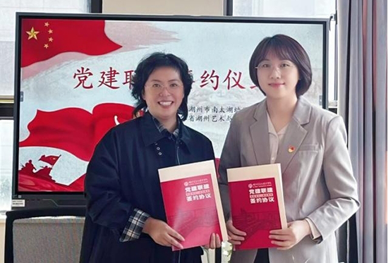 活動伊始,浙江省湖州藝術(shù)與設(shè)計學(xué)校第二黨支部書記李璟與湖州市南太湖幼兒園黨支部書記、園長孫俟萁分別介紹了各自支部的黨建工作特色、師資力量與育人方向,正式簽署《黨建聯(lián)建合作協(xié)議》。學(xué)校授權(quán)南太湖幼兒園將《綠青山小調(diào)組歌》作為在地研究教學(xué)資源。