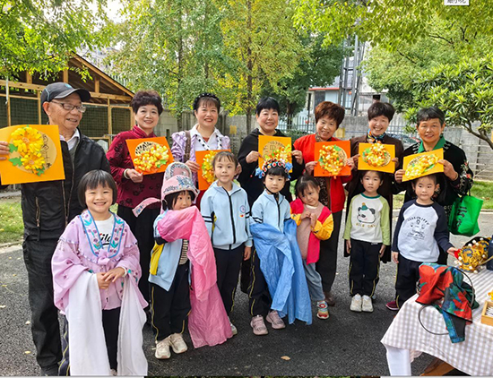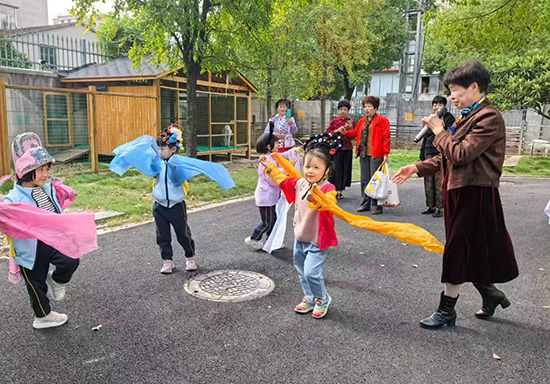 9時(shí)50分,“暖心時(shí)光:共玩道地”環(huán)節(jié)開啟。老年教育學(xué)員們按提前分組,分別前往相應(yīng)班級,與孩子們親切互動(dòng)。初識環(huán)節(jié)中,學(xué)員們主動(dòng)表達(dá)需求,孩子們禮貌回應(yīng),快速拉近距離;道地共玩時(shí),爺爺奶奶現(xiàn)場展示越劇演唱、樂器演奏、太極功夫扇等拿手本領(lǐng),孩子們好奇體驗(yàn),還熱情邀請長輩參與民間游戲,歡聲笑語不斷;活動(dòng)尾聲,孩子們將提前準(zhǔn)備的禮物送給爺爺奶奶,附上真摯的節(jié)日祝福;學(xué)員們則為孩子佩戴重陽節(jié)特制徽章,小小的徽章承載著跨代情誼,為活動(dòng)畫上圓滿句號。