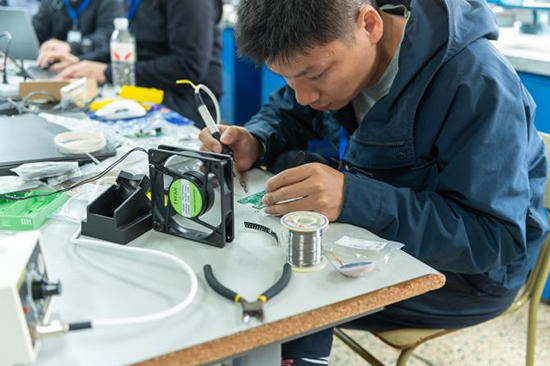 作為職業(yè)教育創(chuàng)新創(chuàng)業(yè)生態(tài)的核心支撐,中職教師的創(chuàng)新實(shí)踐能力、成果轉(zhuǎn)化能力直接決定著學(xué)生創(chuàng)新素養(yǎng)的培育質(zhì)量。此次賽事精準(zhǔn)聚焦師資能力短板,以 “實(shí)戰(zhàn)化” 競賽設(shè)計(jì)構(gòu)建起師資能力提升的 “閉環(huán)體系”。在3小時(shí)的文本制作環(huán)節(jié),教師需完成創(chuàng)新作品文稿撰寫與 PPT 制作,考驗(yàn)的不僅是文字表達(dá)能力,更是對創(chuàng)新理念的梳理、技術(shù)方案的論證能力 —— 這正是日常教學(xué)中引導(dǎo)學(xué)生開展項(xiàng)目式學(xué)習(xí)、撰寫創(chuàng)新方案的 “前置訓(xùn)練”;8小時(shí)的現(xiàn)場制作環(huán)節(jié),教師需利用通用工具、基礎(chǔ)材料及自備核心元件完成實(shí)物或模型創(chuàng)作,從圖紙?jiān)O(shè)計(jì)到動手組裝,從問題調(diào)試到功能優(yōu)化,全程模擬真實(shí)創(chuàng)新項(xiàng)目開發(fā)流程,有效彌補(bǔ)了部分教師 “重理論講授、輕實(shí)踐操作” 的能力短板;而6分鐘展示與4分鐘答辯環(huán)節(jié),則要求教師精準(zhǔn)提煉作品創(chuàng)新點(diǎn)、清晰闡述技術(shù)路徑,同時(shí)快速回應(yīng)評委關(guān)于可行性、實(shí)用性的提問,這一過程顯著提升了教師的創(chuàng)新成果表達(dá)能力與臨場應(yīng)變能力,為后續(xù)指導(dǎo)學(xué)生參與各類創(chuàng)新競賽積累了全流程的寶貴經(jīng)驗(yàn)。