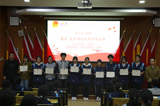 儀式第二項(xiàng)議程中,院團(tuán)委副書記劉栩吟對(duì) 202506 期業(yè)余團(tuán)校培訓(xùn)工作進(jìn)行總結(jié)。她回顧了學(xué)員們共同學(xué)習(xí)、共同進(jìn)步的歷程,肯定了大家在培訓(xùn)期間展現(xiàn)出的良好精神風(fēng)貌,并宣讀了團(tuán)校結(jié)業(yè)學(xué)員名單。隨后,院團(tuán)委書記劉非、院團(tuán)委副書記劉栩吟為業(yè)余團(tuán)校學(xué)員代表頒發(fā)結(jié)業(yè)證書。