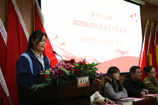 儀式第四項(xiàng)議程,2412 班董子晴同學(xué)作為優(yōu)秀學(xué)員代表發(fā)言,她分享了自己在團(tuán)校學(xué)習(xí)中的心得與感悟,言語(yǔ)間滿是對(duì)團(tuán)的熱愛與對(duì)未來的期許,也引發(fā)了在場(chǎng)學(xué)員的強(qiáng)烈共鳴。